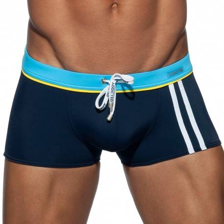 Low-rise swim boxer. Sexy and fitted cut. Removable Pack Up foam system to enhance your masculinity. Sporty double stripe on the left thigh. Contrasting elastic waistband with drawstring. Addicted silicone logo. Made in Barcelona.