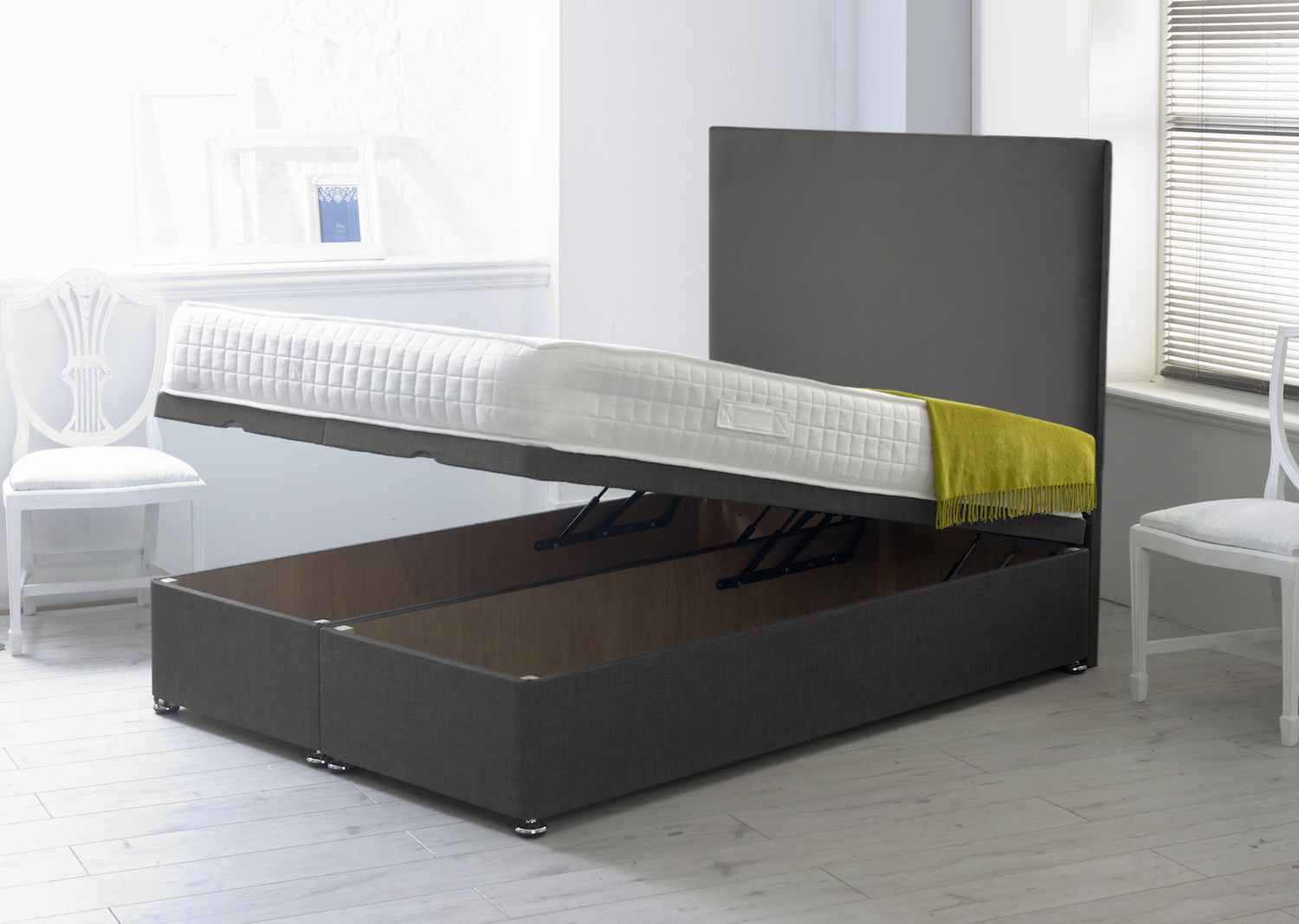The Luxury Ottoman Base provides great mattress support along with bringing a huge selection of storage space for the bedroom. The platform top ottoman base features gas lift arms which makes it easy and simple for the base to be lifted. A huge variety of storage space sits under the base which is ideal for storing spare bedding and accessories. This base is upholstered in a selection of luxurious fabrics, the total base depth is approximately 14 Inch with a generous 11 inch depth of internal storage space. The mattress is not included but can be purchased seperately. Included with the bed is the Floor Standing headboard made with sturdy chipboard, the headboard is strong and has a deep layer of hard wearing foam which makes it comfortable to lean against when sitting up in bed.